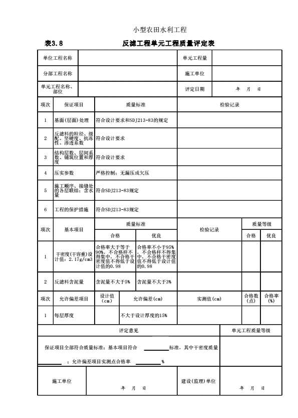 表格名称:表3.8 反滤工程单元工程质量评定表