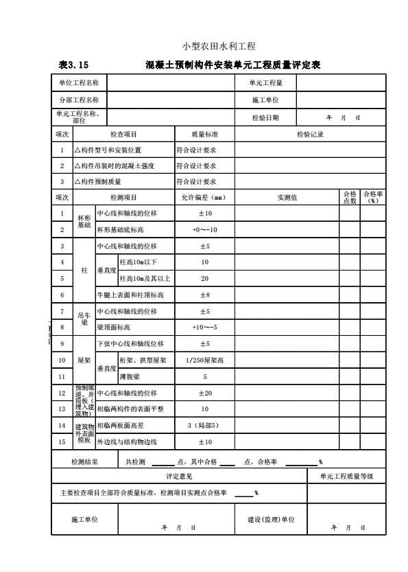 表格名称:表3.15 混凝土预制构件安装单元工程质量评定表