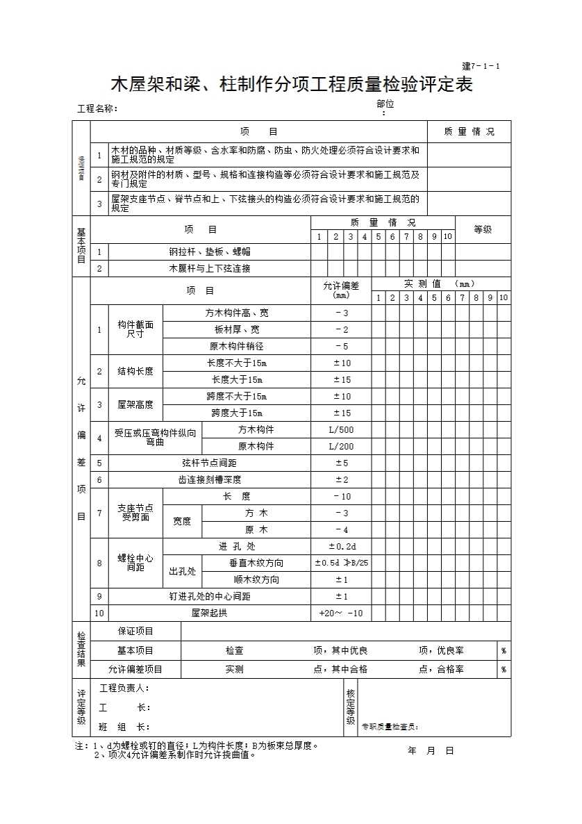 表格名称:木屋架和梁、柱制作分项工程质量检验评定表