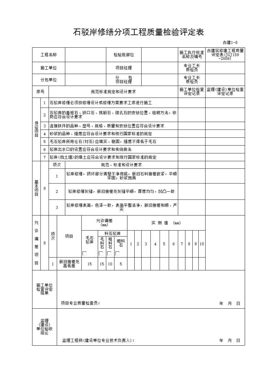 表格名称:古建1-8 石驳岸修缮分项工程质量检验评定表