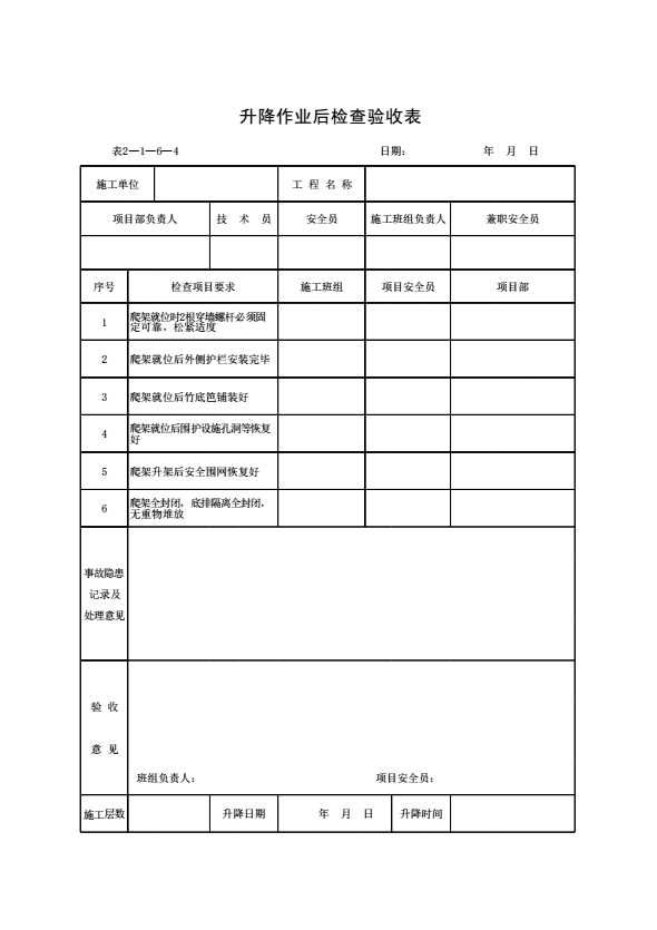 表格名称:升降作业后检查验收表 表2—1—6—4