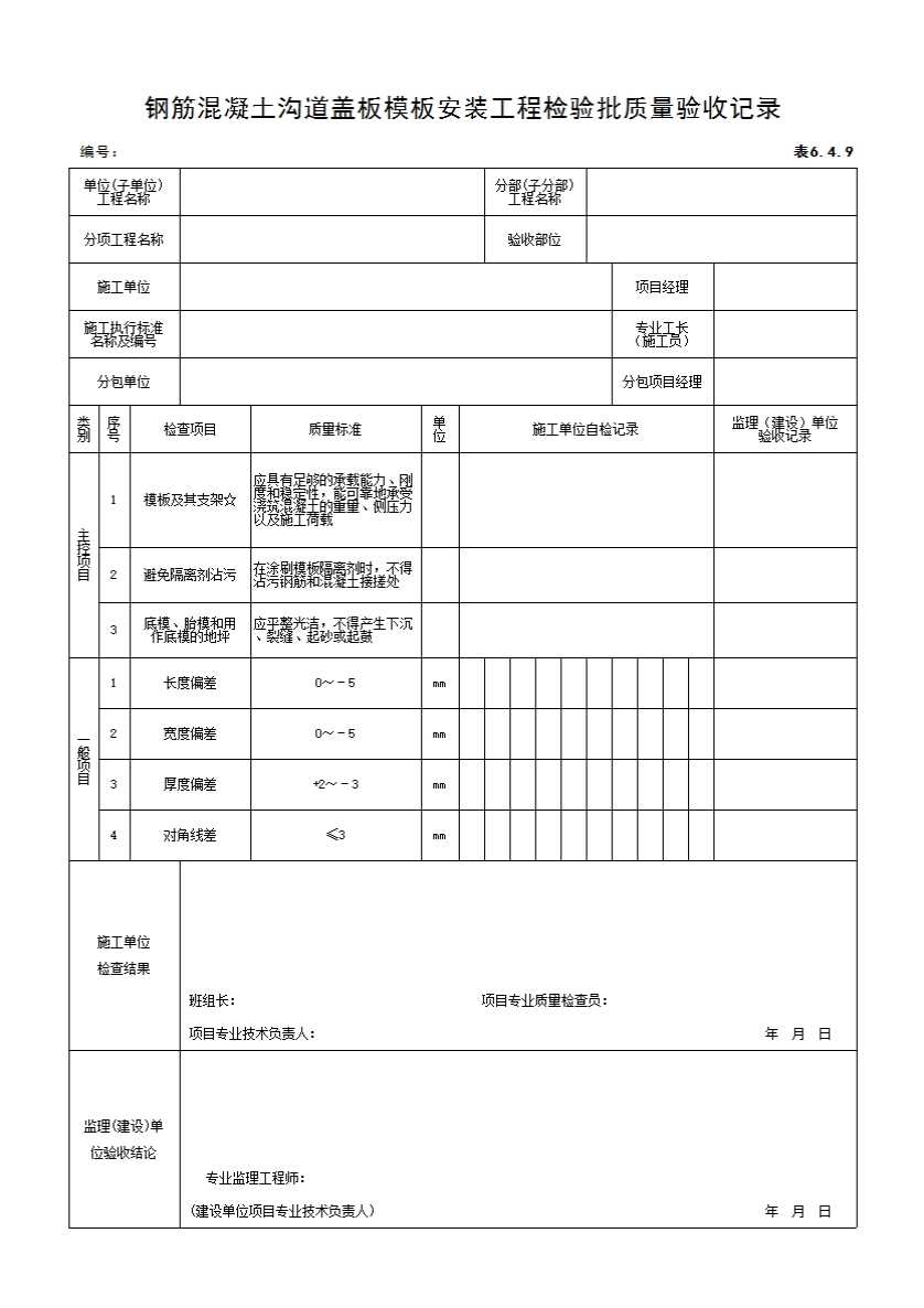 表格名称:6.4.9 钢筋混凝土沟道盖板模板安装工程检验批质量验收记录