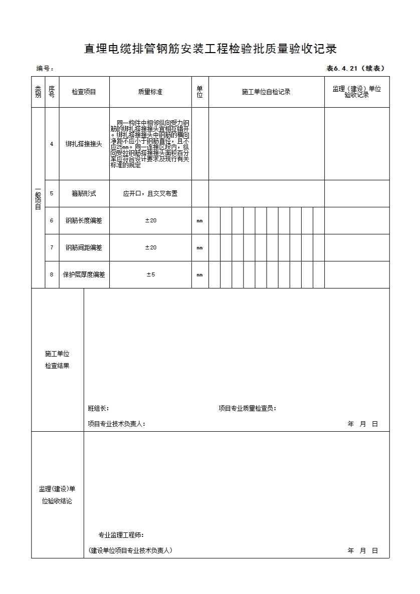表格名称:6.4.21 直埋电缆排管钢筋安装工程检验批质量验收记录