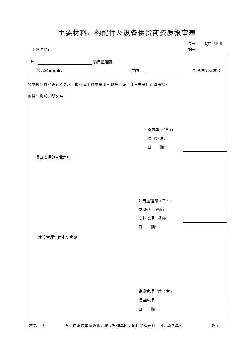 DJB-A9-01 主要材料、构配件及设备供货商资质报审表
