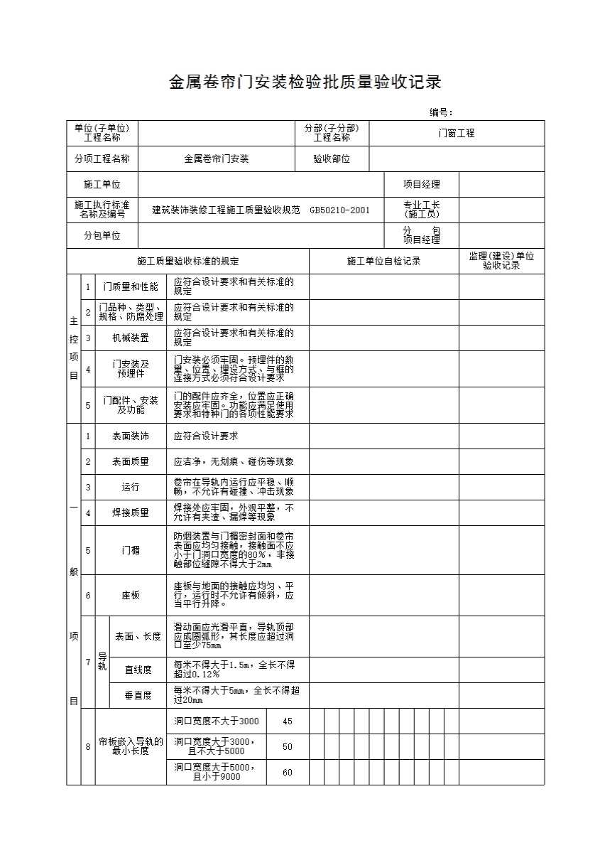 表格名称:金属卷帘门安装检验批质量验收记录