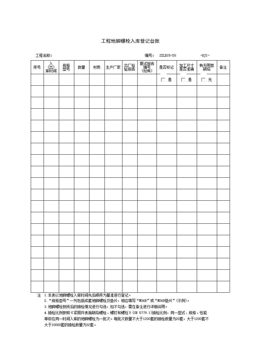表格名称:SZLB15 工程地脚螺栓入库登记台账