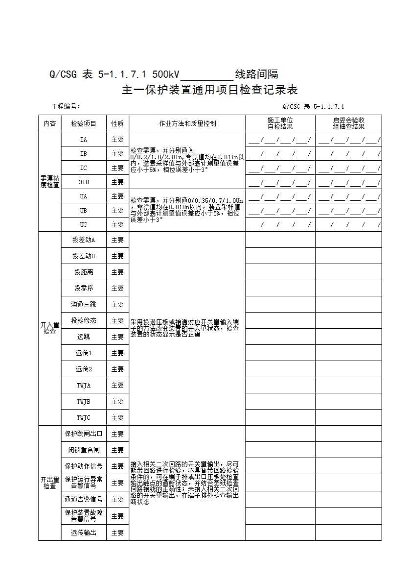 表格名称:QCSG 表 5-1.1.7.1 500kV______线路间隔 主一保护装置通用项目检查记录表
