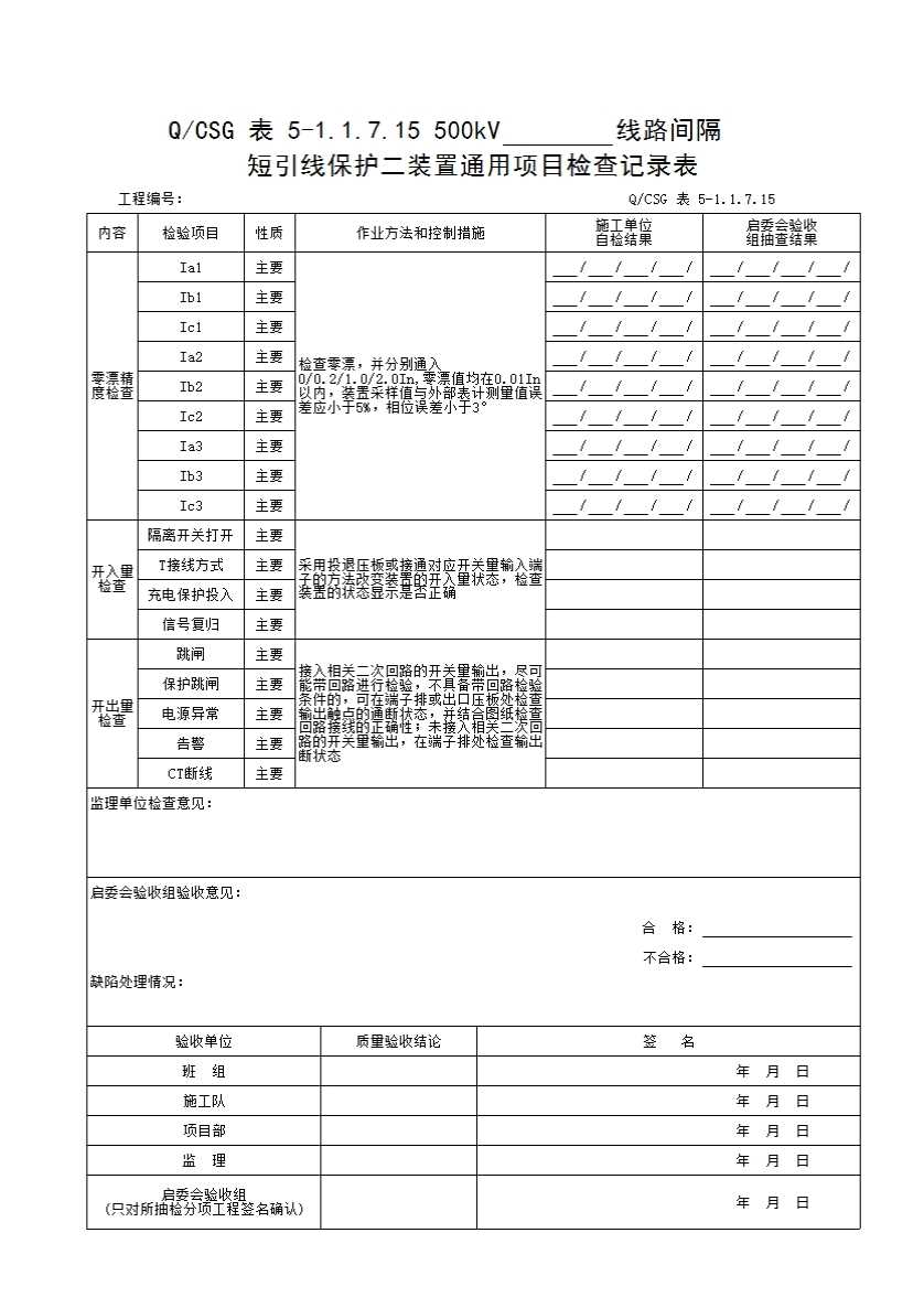 表格名称:QCSG 表 5-1.1.7.15 500kV______线路间隔 短引线保护二装置通用项目检查记录表