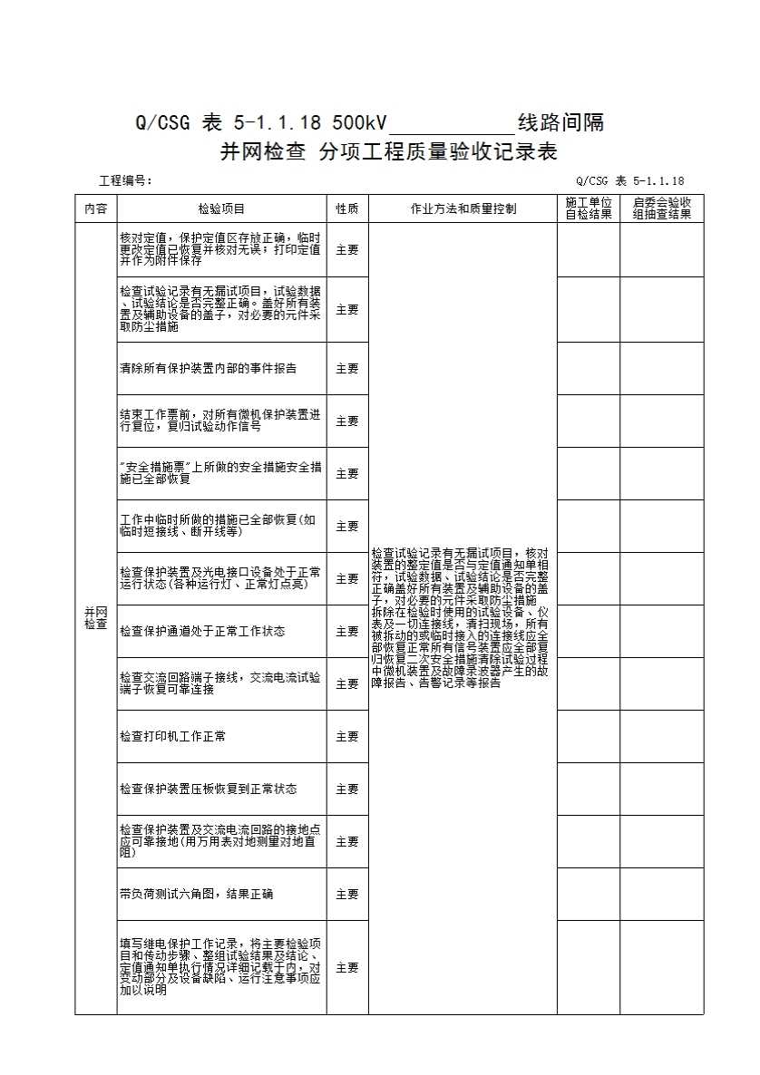 表格名称:QCSG 表 5-1.1.18 500kV______线路间隔 并网检查 分项工程质量验收记录表