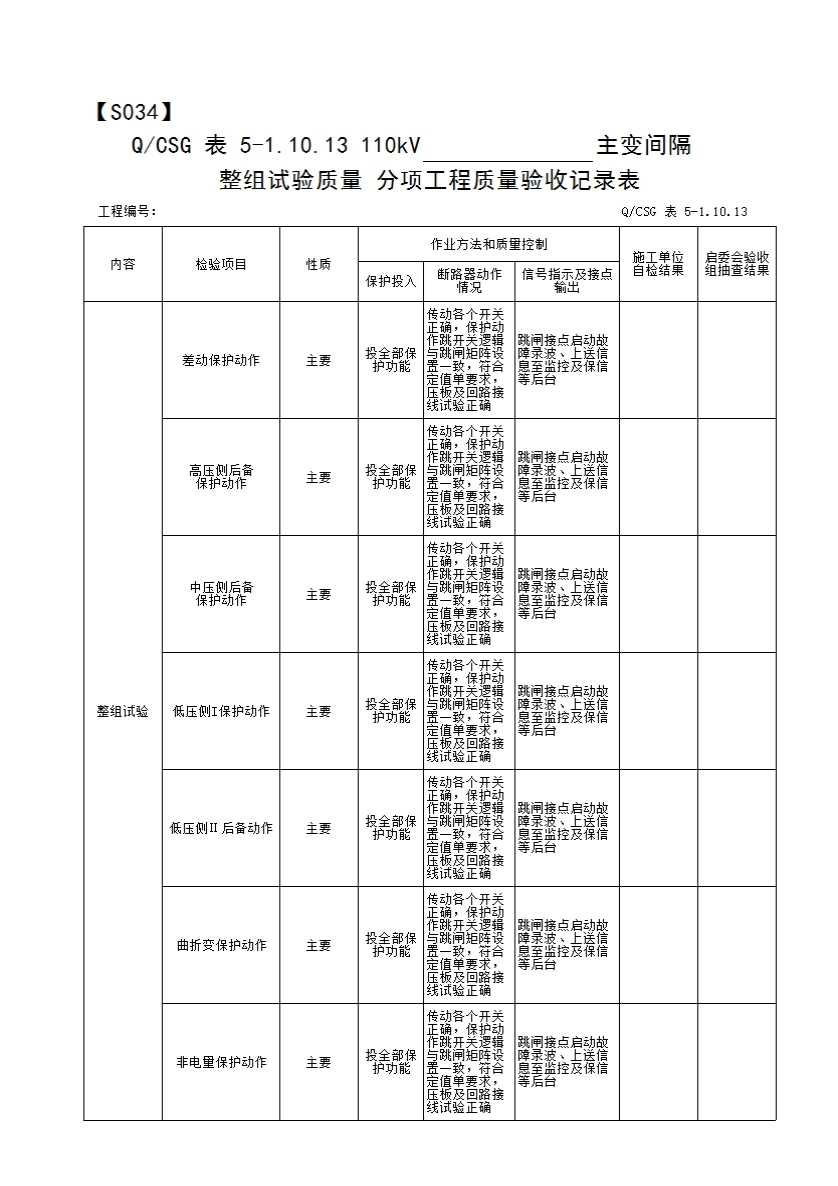 表格名称:QCSG 表 5-1.10.13 110kV______主变间隔整组试验质量 分项工程质量验收记录表
