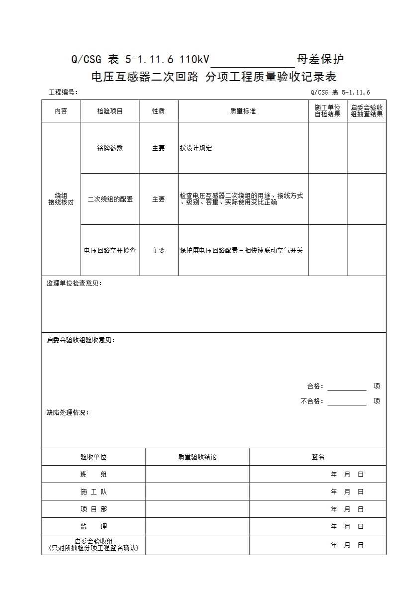 表格名称:QCSG 表 5-1.11.6 110kV______母差保护电压互感器二次回路 分项工程质量验收记录表