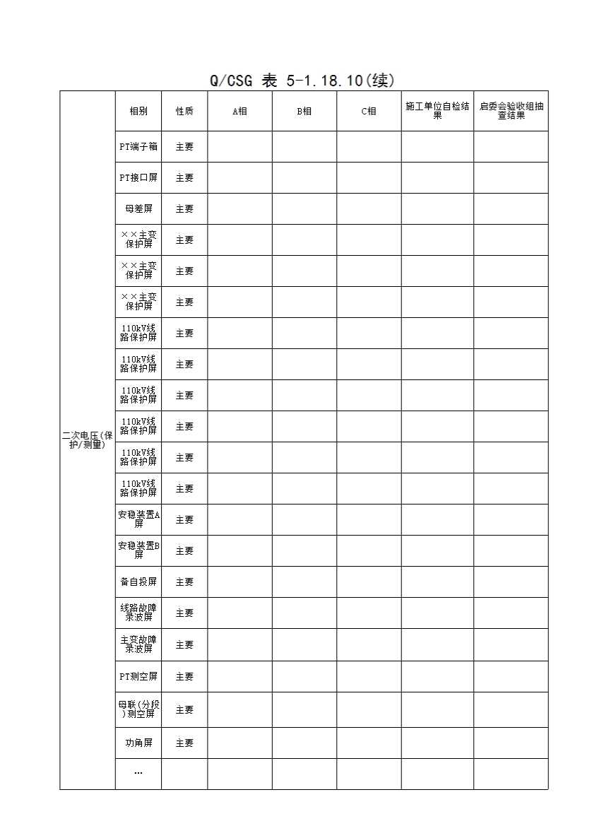 表格名称:QCSG 表 5-1.18.10 ______PT间隔电压回路通压试验 分项工程质量验收记录表
