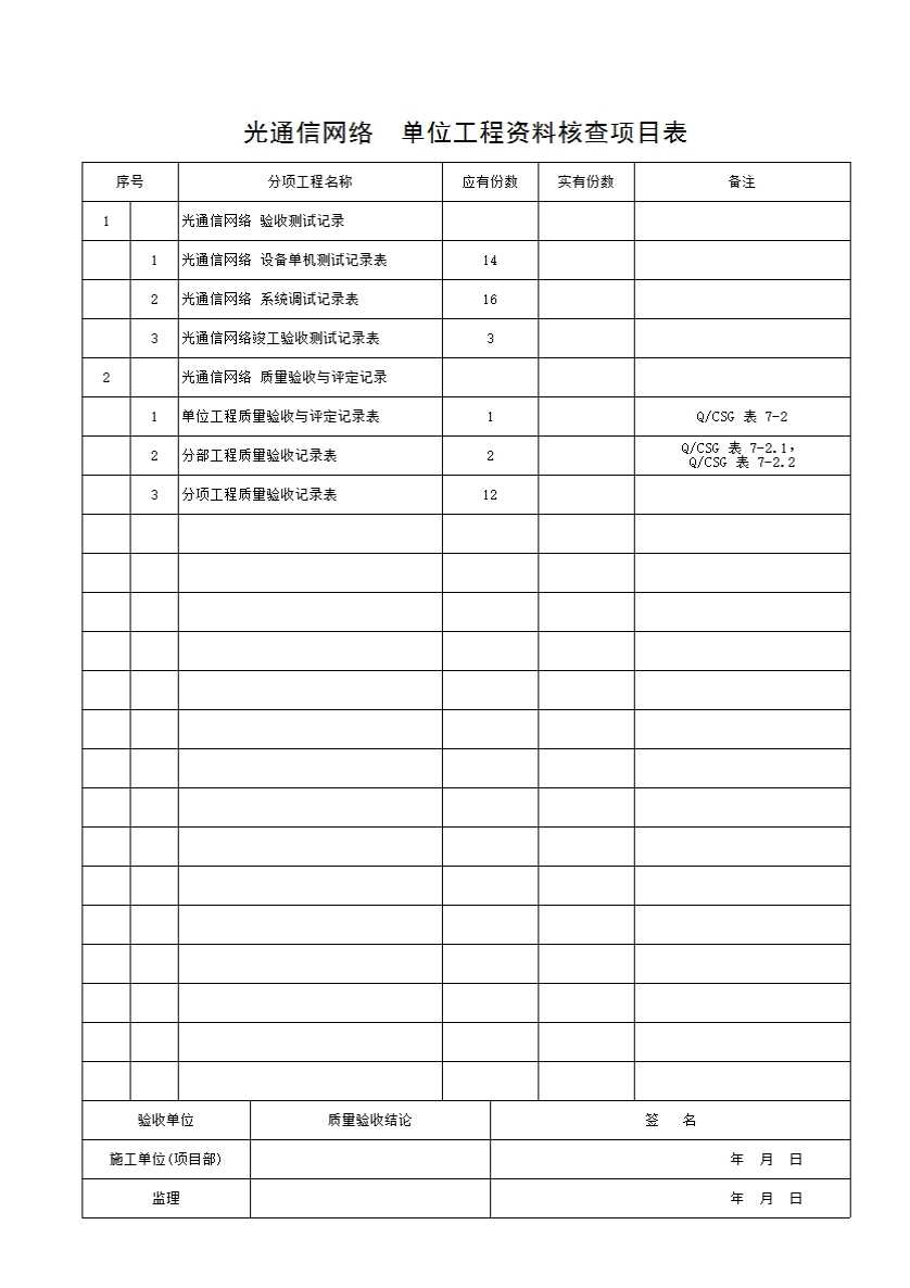 表格名称:二、光通信网络 单位工程资料核查项目表
