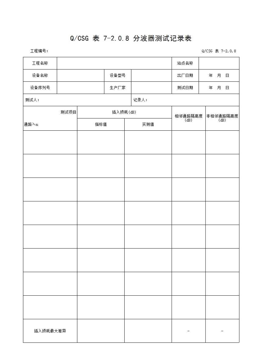 表格名称:QCSG 表 7-2.0.8 分波器测试记录表