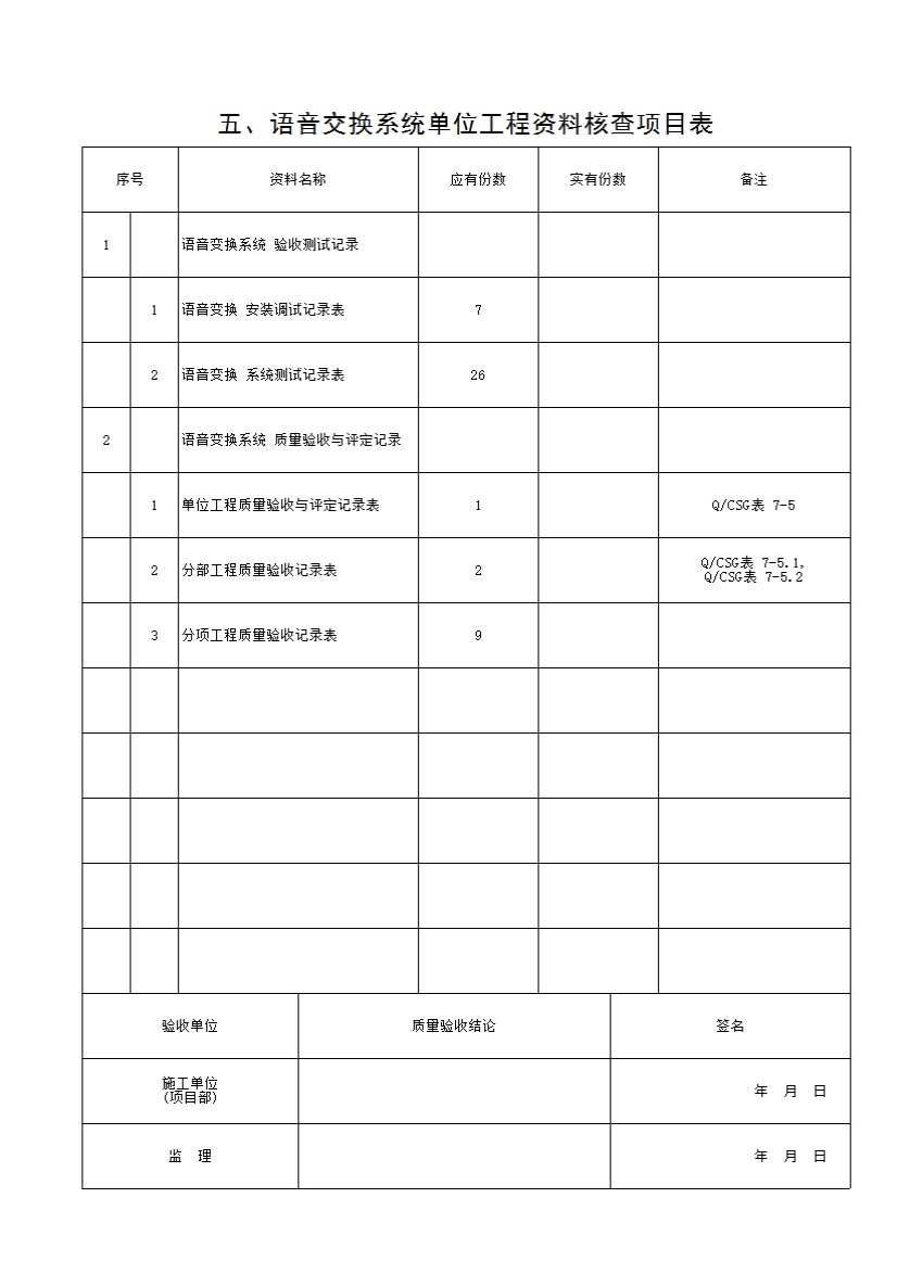 表格名称:五、语音交换系统 单位工程资料核查项目表