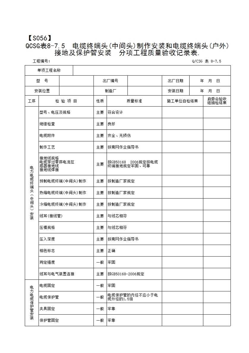 QCSG表8-7.5 电缆终端头(中间头)制作安装和电缆终端头(户外)接地及保护管安装 分项工程质量验收记录表