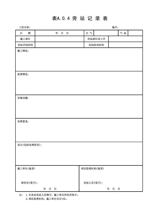 表格名称:表A.0.4 旁站记录表