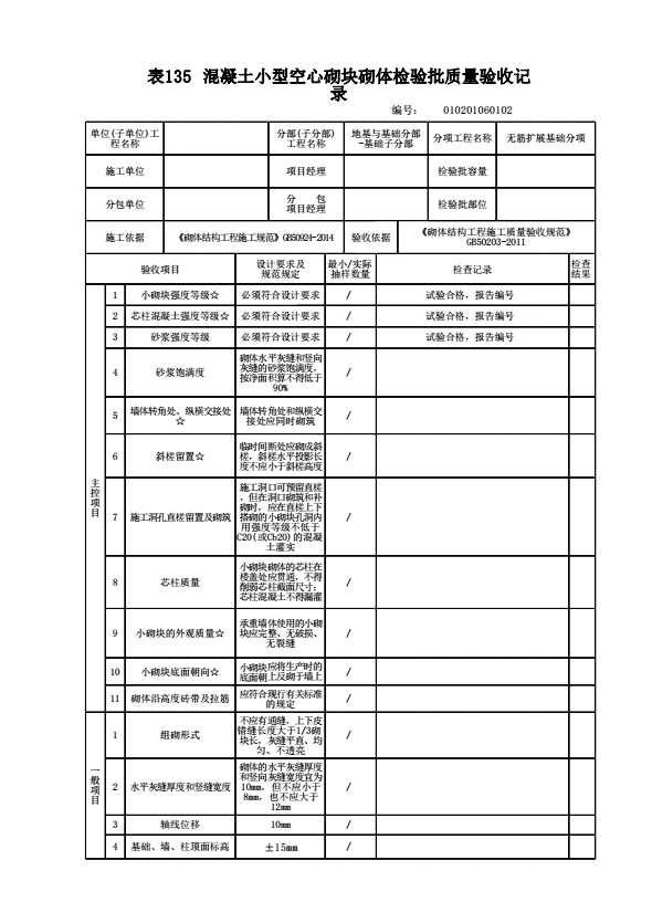 表格名称:010201060102 混凝土小型空心砌块砌体检验批质量验收记录