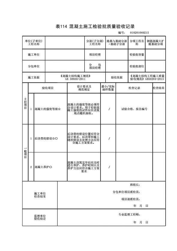 表格名称:010201060215 混凝土施工检验批质量验收记录