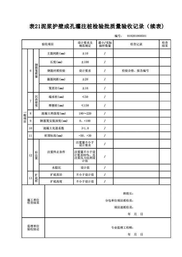 表格名称:010201060501 泥浆护壁成孔灌注桩检验批质量验收记录