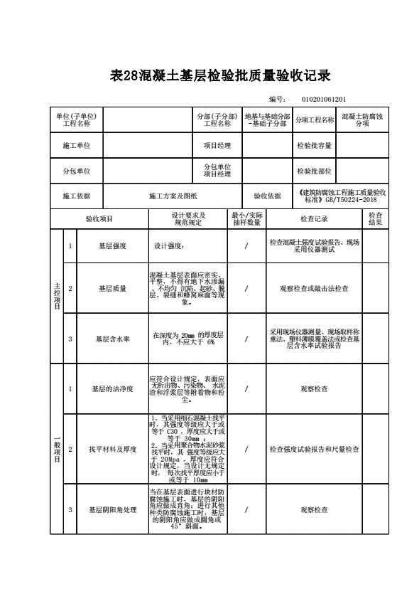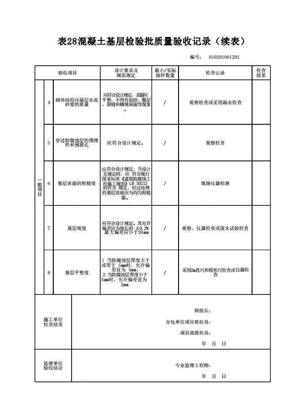 表格名称:010201061201 混凝土基层检验批质量验收记录