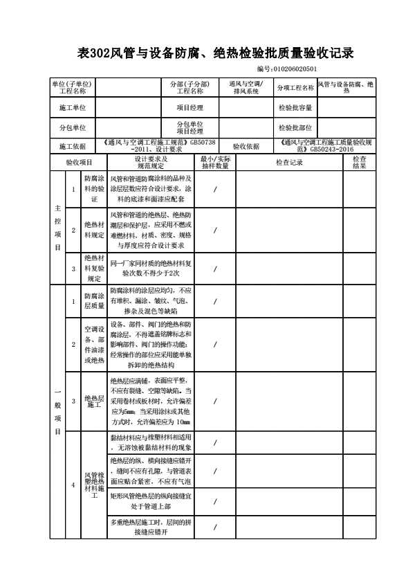 表格名称:010206020501 风管与设备防腐、绝热检验批质量验收记录