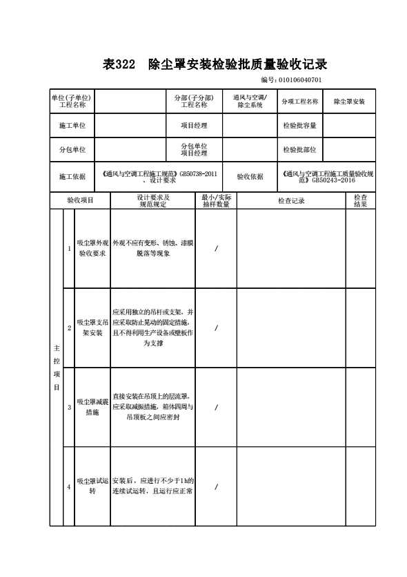 表格名称:010206040701 除尘罩安装检验批质量验收记录