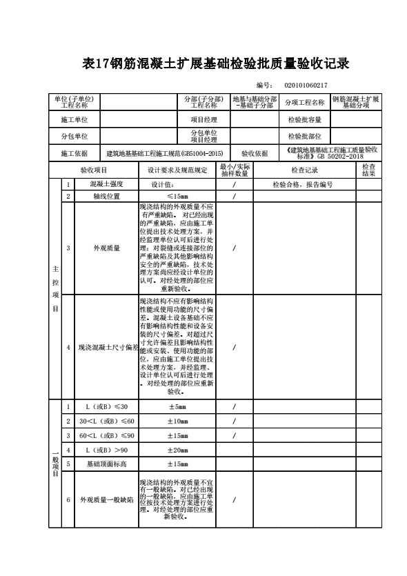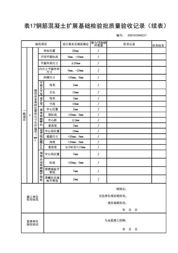 表格名称:020101060217 钢筋混凝土扩展基础检验批质量验收记录