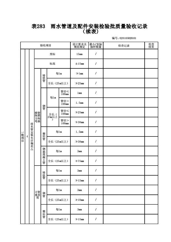 表格名称:020105020201 雨水管道及配件安装检验批质量验收记录