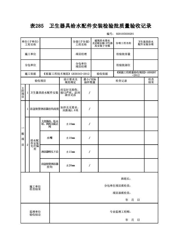 表格名称:020105030201 卫生器具给水配件安装检验批质量验收记录