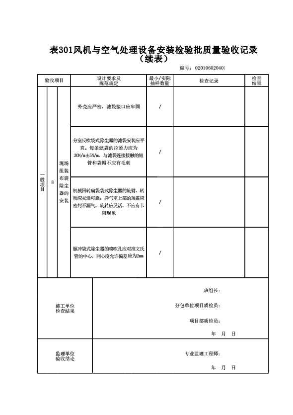 表格名称:020106020401 风机与空气处理设备安装检验批质量验收记录