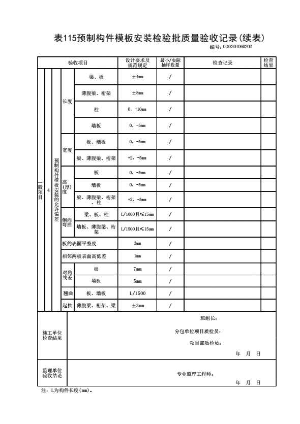 表格名称:030201060202 预制构件模板安装检验批质量验收记录