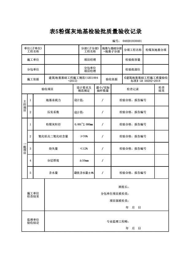 表格名称:040201030401 粉煤灰地基检验批质量验收记录
