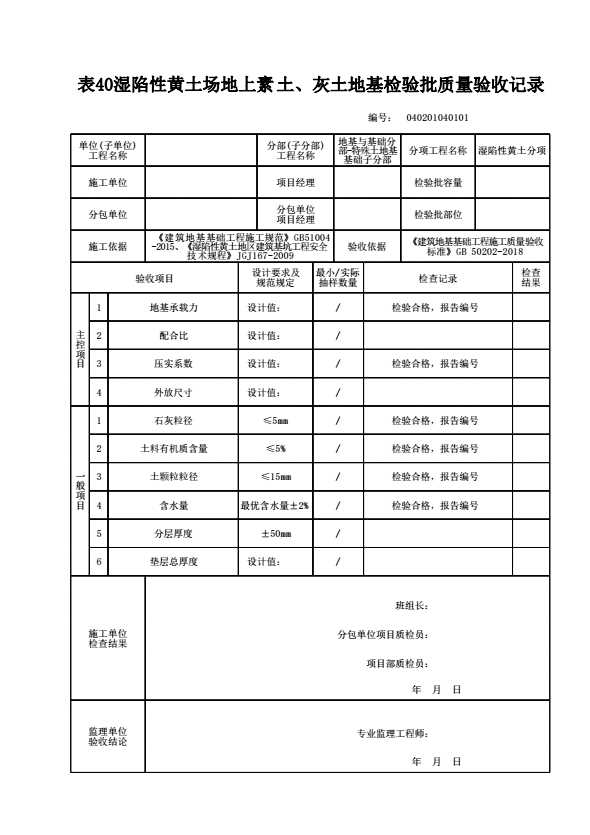 表格名称:040201040101 湿陷性黄土场地上素土、灰土地基检验批质量验收记录