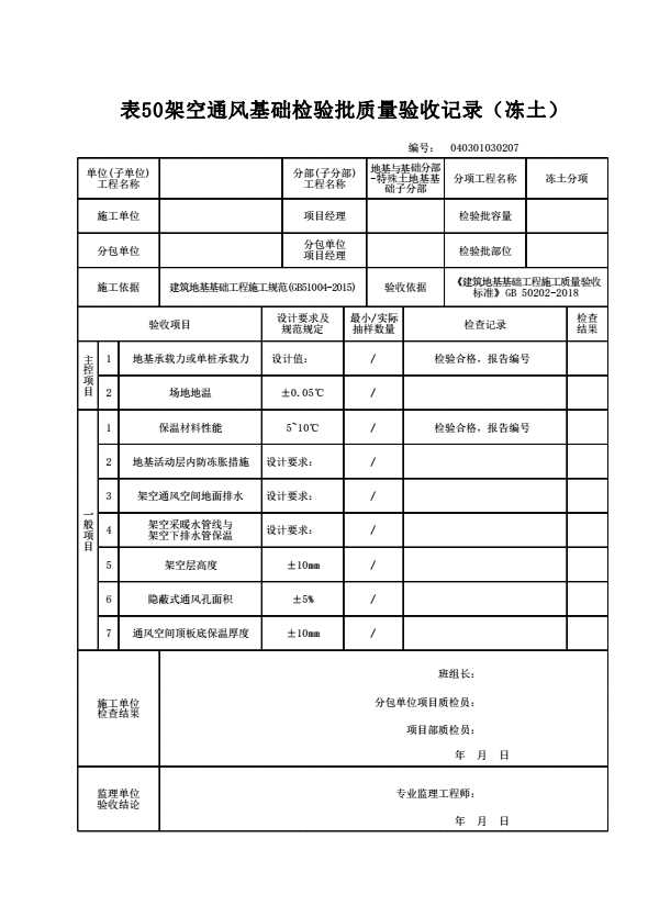 表格名称:040301030207 架空通风基础检验批质量验收记录(冻土)