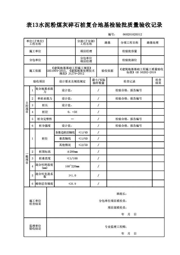 表格名称:060201020312 水泥粉煤灰碎石桩复合地基检验批质量验收记录