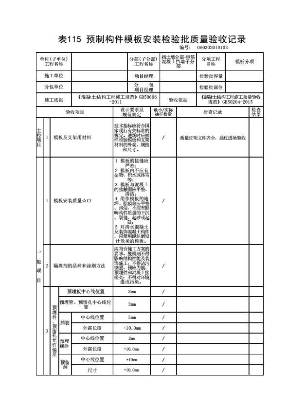 表格名称:060302010103 预制构件模板安装检验批质量验收记录
