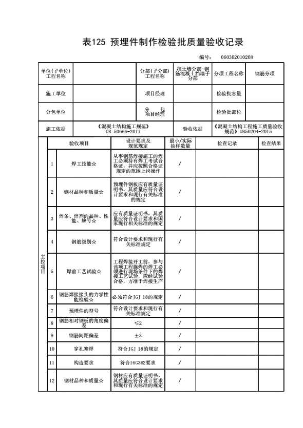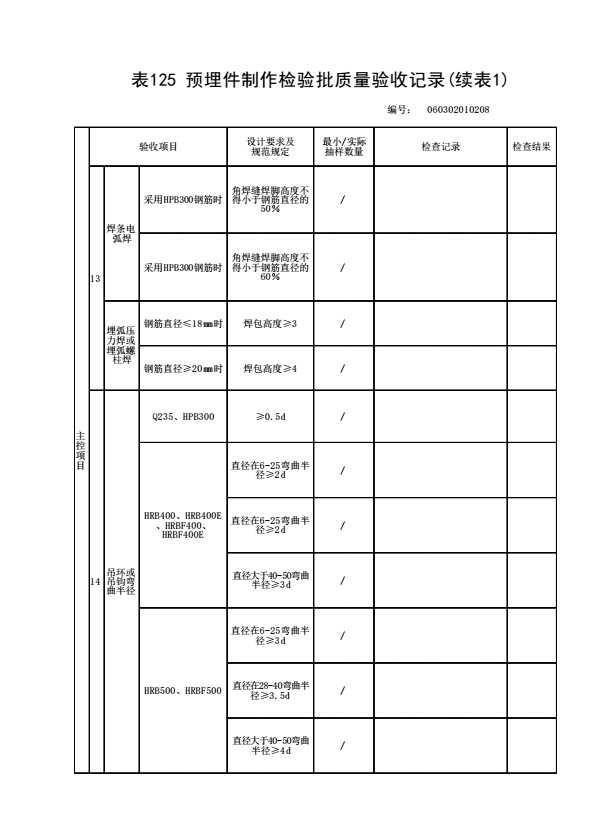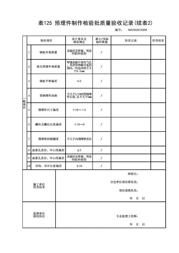 表格名称:060302010208 预埋件制作检验批质量验收记录