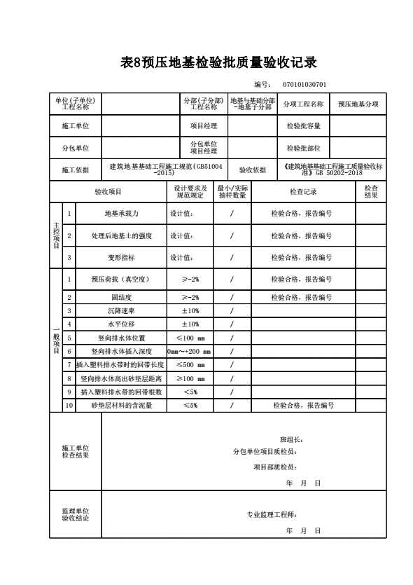 表格名称:070101030701 预压地基检验批质量验收记录
