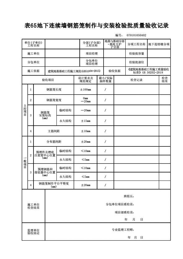 表格名称:070101050402 地下连续墙钢筋笼制作与安装检验批质量验收记录