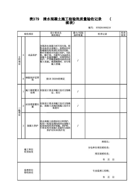 表格名称:070201060218 清水混凝土施工检验批质量验收记录