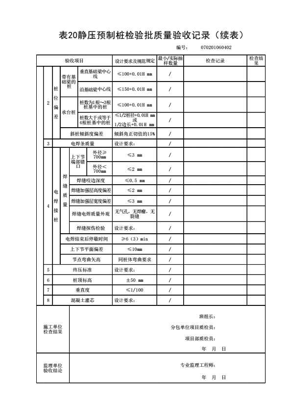 表格名称:070201060402 静压预制桩检验批质量验收记录