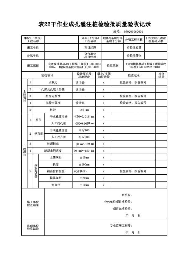 表格名称:070201060601 干作业成孔灌注桩检验批质量验收记录