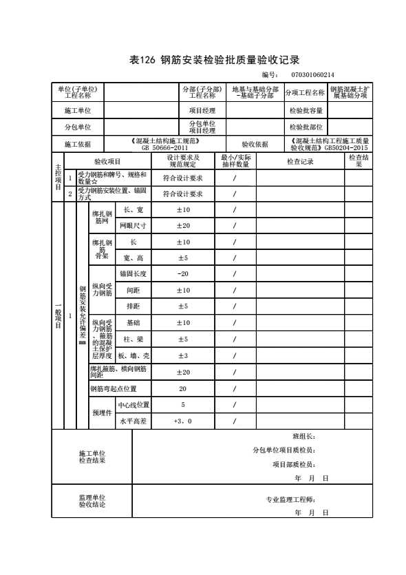 表格名称:070301060214 钢筋安装检验批质量验收记录