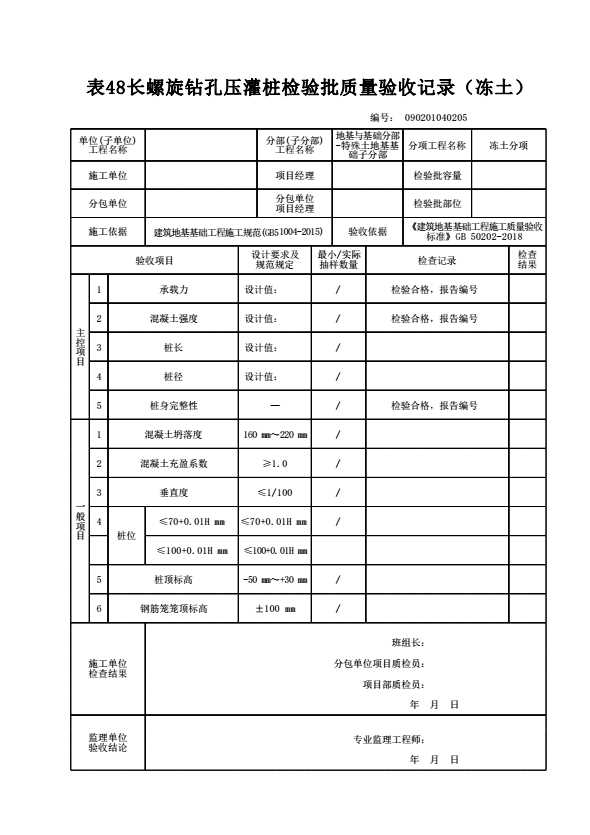 表格名称:090201040205 长螺旋钻孔压灌桩检验批质量验收记录(冻土)