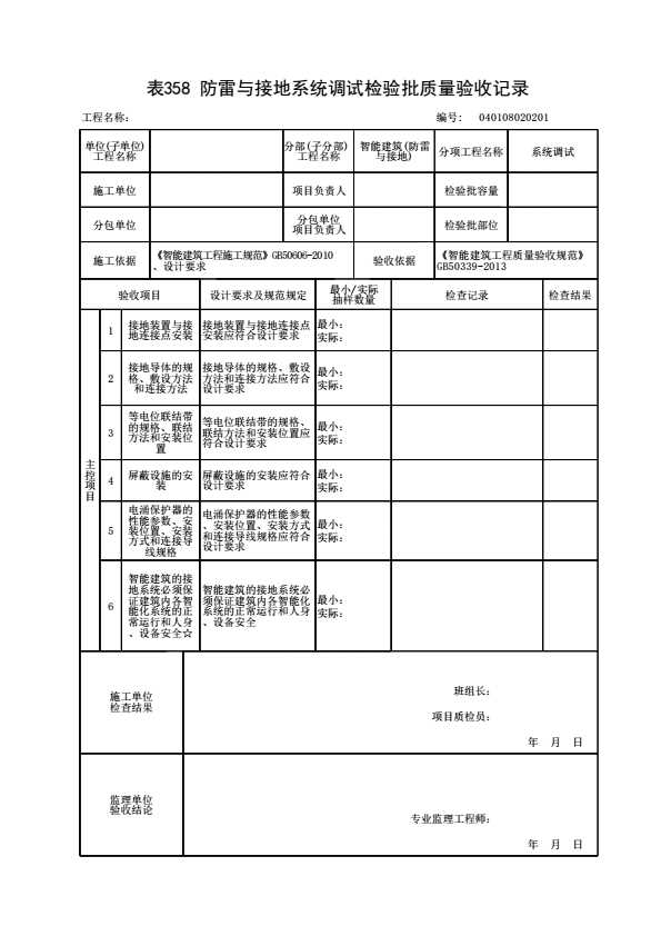 表格名称:040108020201 防雷与接地系统调试检验批质量验收记录