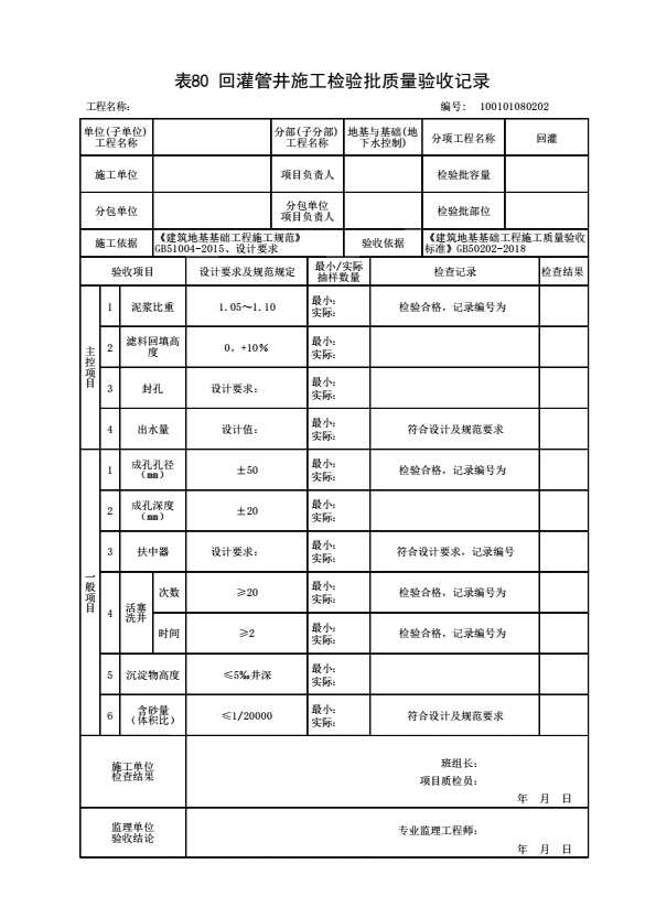 表格名称:100101080202 回灌管井施工检验批质量验收记录