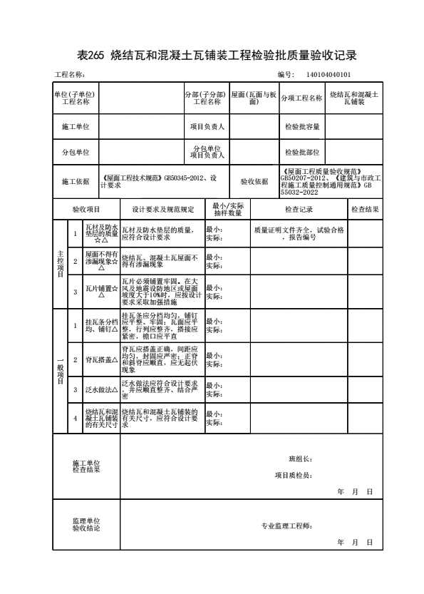 表格名称:140104040101 烧结瓦和混凝土瓦铺装工程检验批质量验收记录