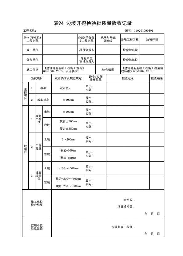 表格名称:140201090301 边坡开挖检验批质量验收记录