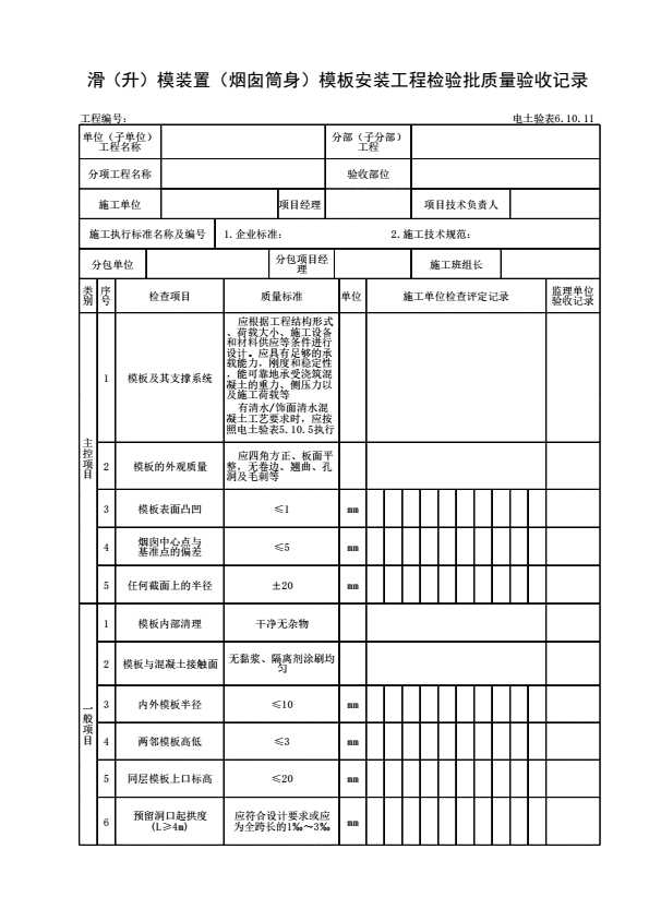 表格名称:电土验表6.10.11 滑(升)模装置(烟囱筒身)模板安装工程检验批质量验收记录